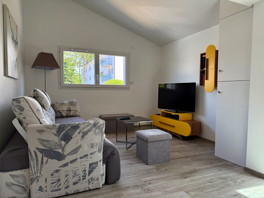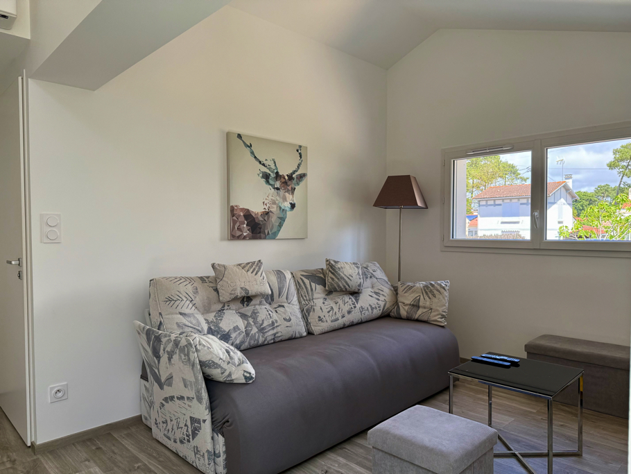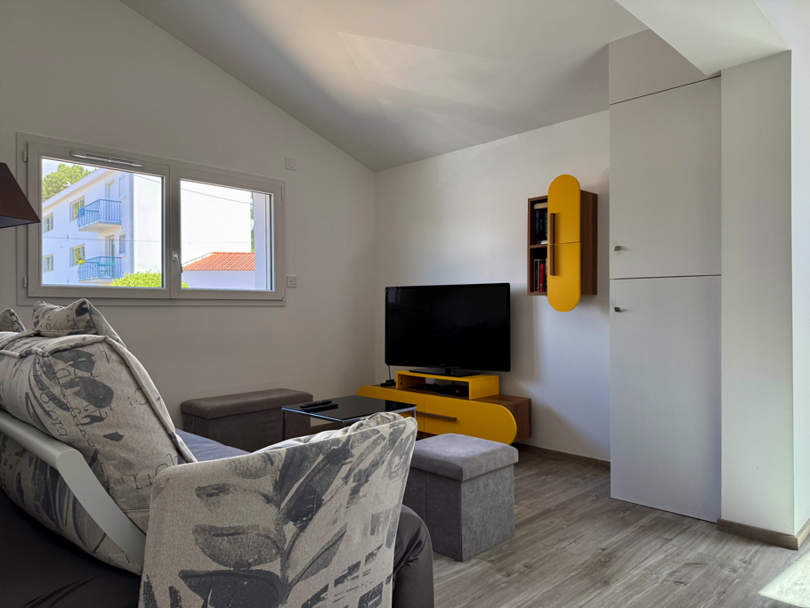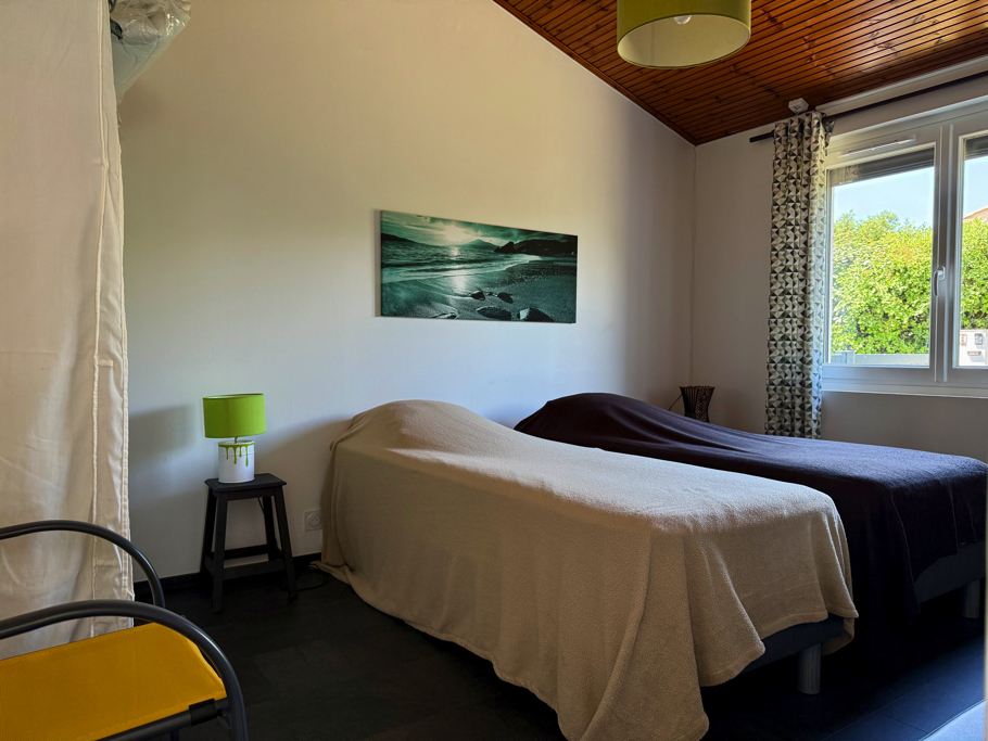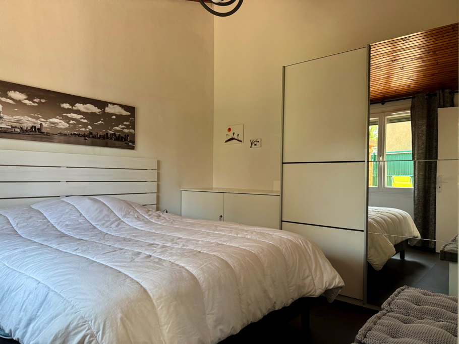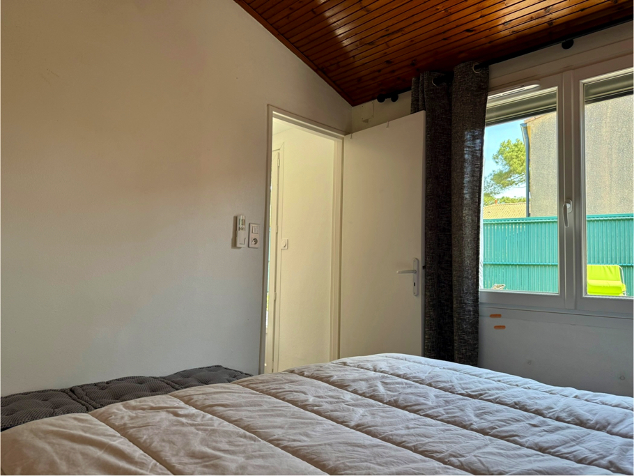 À l’intérieur, vous découvrirez une pièce de vie lumineuse avec un coin séjour, un coin salon équipé d’un canapé et d’une télévision, ainsi qu’une cuisine moderne et entièrement équipée (réfrigérateur, four multi-fonctions, plaques vitrocéramiques, lave-vaisselle, lave-linge et nombreux rangements). La maison dispose également de deux chambres : une avec un lit double (160x200) et une avec deux lits simples (80x200), d’une salle d’eau contemporaine et de WC séparés. Climatisée, elle garantit un confort optimal en toutes saisons. Enfin, deux places de parking privées sont à disposition devant la maison, un atout précieux dans ce secteur recherché.